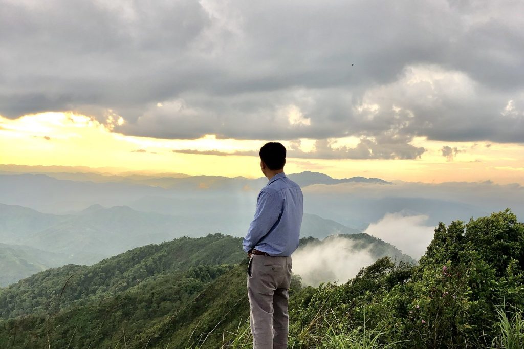 Trên độ cao 1.884 mét so với mặt nước biển của đỉnh Khoan La San, chúng ta có thể phóng tầm nhìn ra xa ngút ngàn theo cả ba hướng của cột mốc. Vào buổi trời trong, không gian là một màu xanh ngăn ngắt. Những dải mây trắng muốt, khổng lồ bồng bềnh trôi nhẹ ngay dưới chân cho ta cái cảm giác “chân đạp mây bay, tóc vờn gió núi” của người lính Biên phòng trên đường lên điểm tựa.